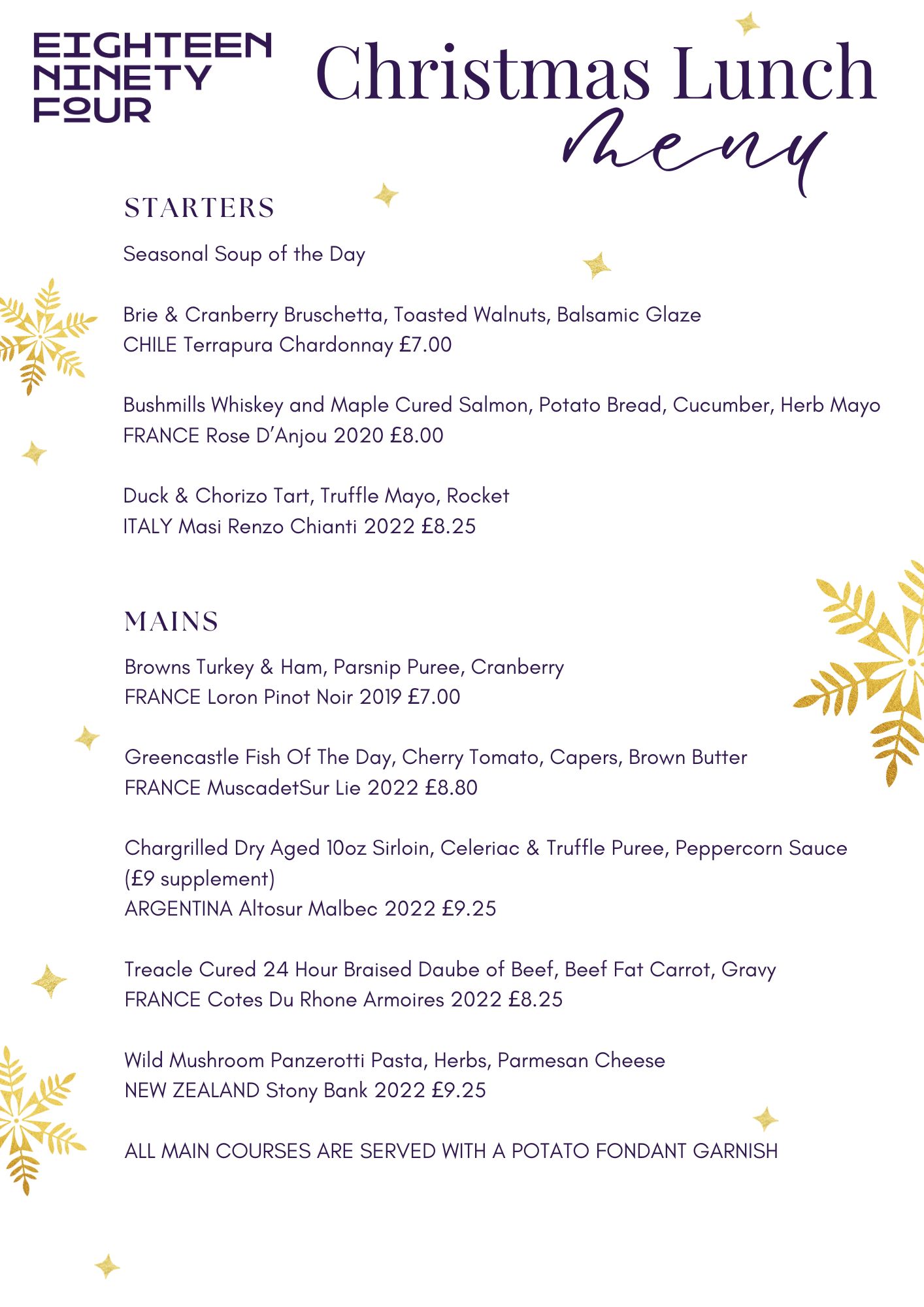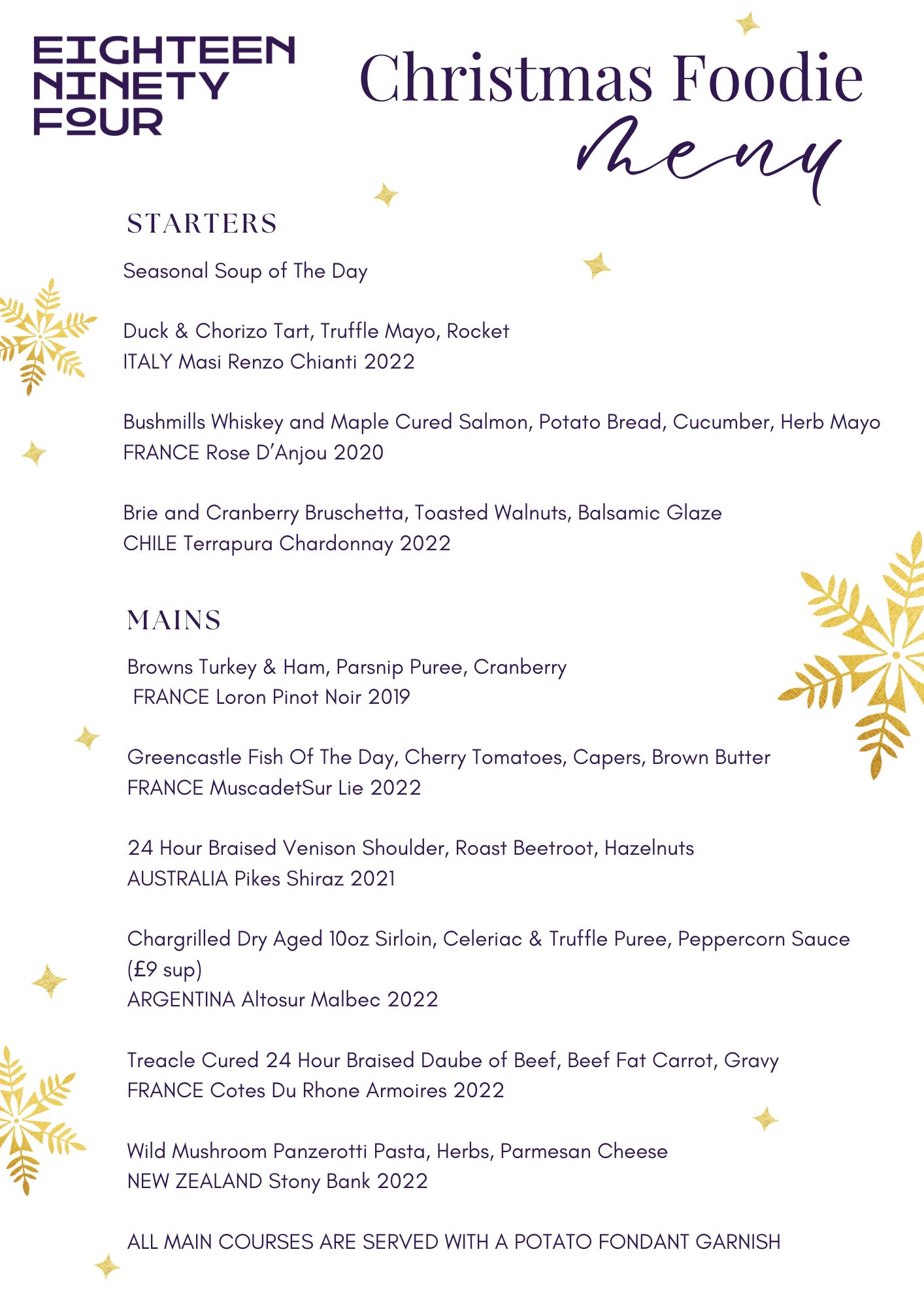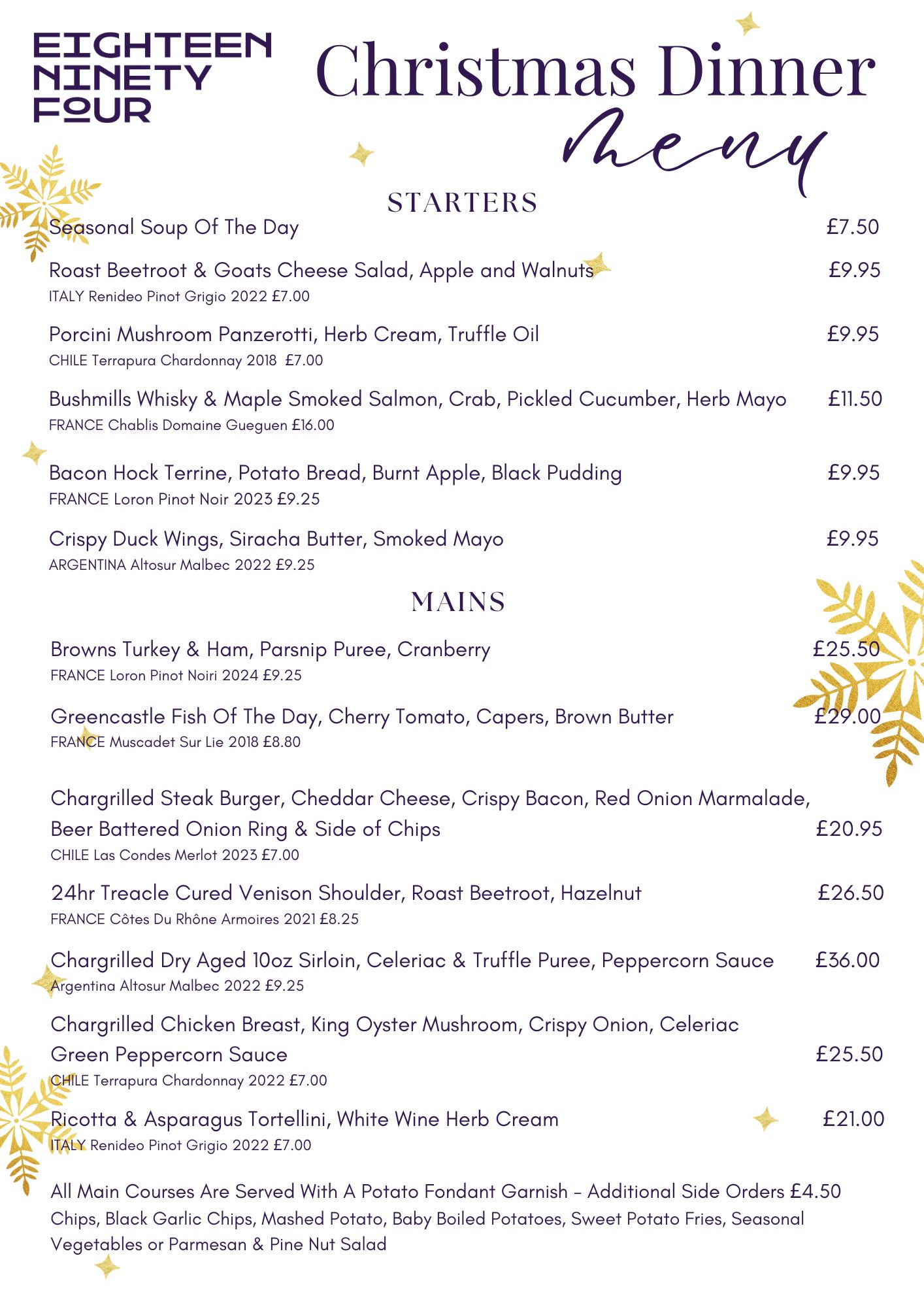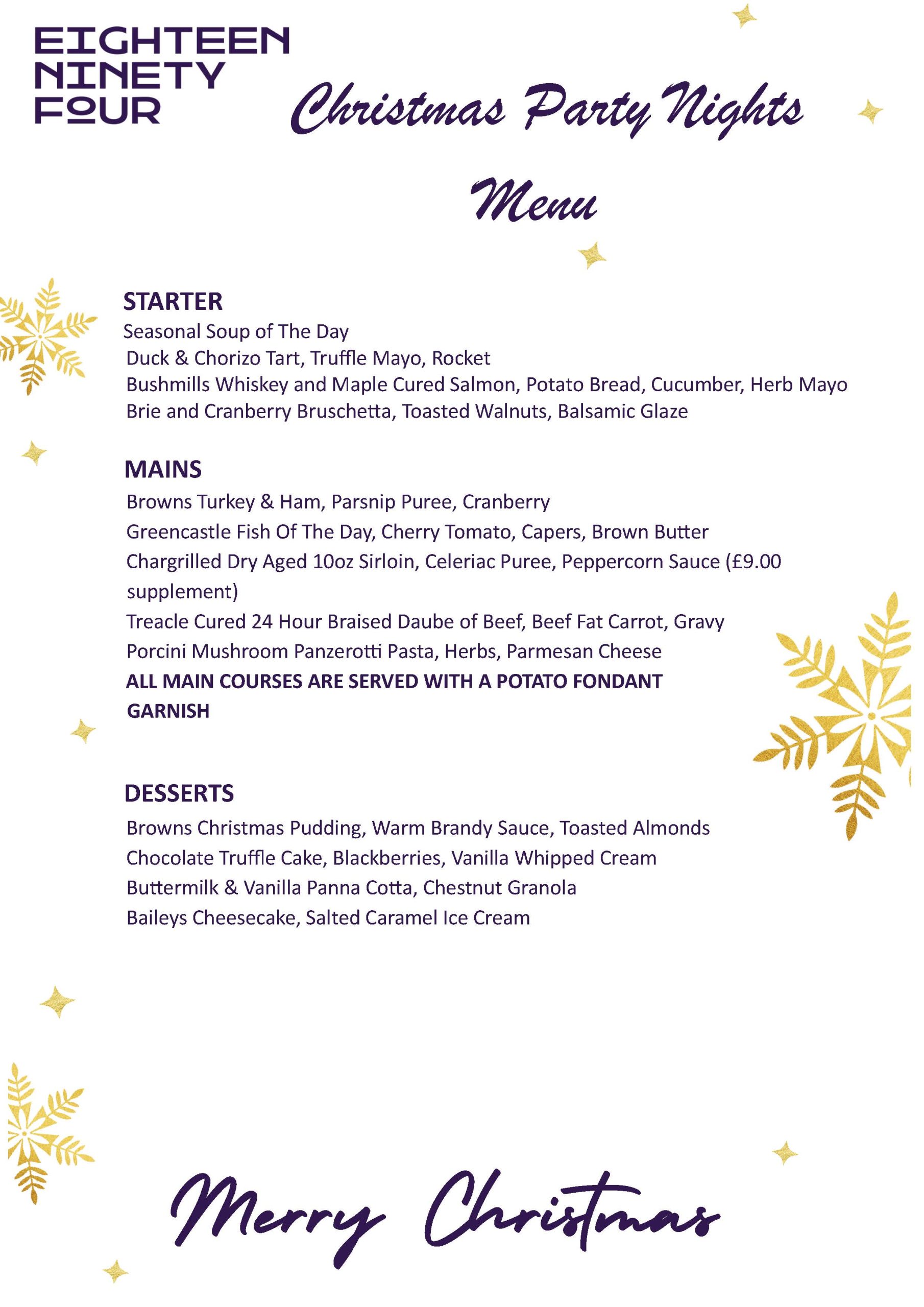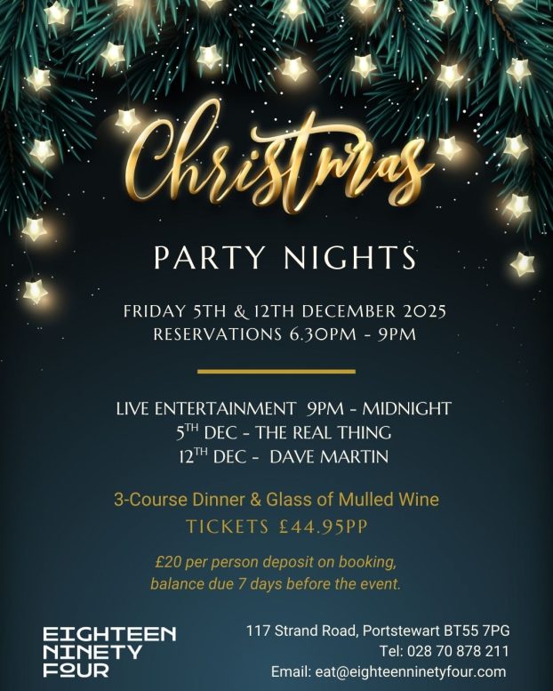 Welcome to Christmas Dining at Eighteen Ninety Four in Portstewart. As the festive season approaches, our chefs are preparing a menu that brings together seasonal flavors and local ingredients, ensuring a memorable dining experience. Set against the serene backdrop of Portstewart Strand, Eighteen Ninety Four offers a warm and inviting ambiance perfect for festive celebrations. Whether you’re planning an intimate dinner or a larger gathering, join us this Christmas and make your festive moments truly special. Christmas menus will commence Thursday 4th December 2025. Scroll down to view our menus.